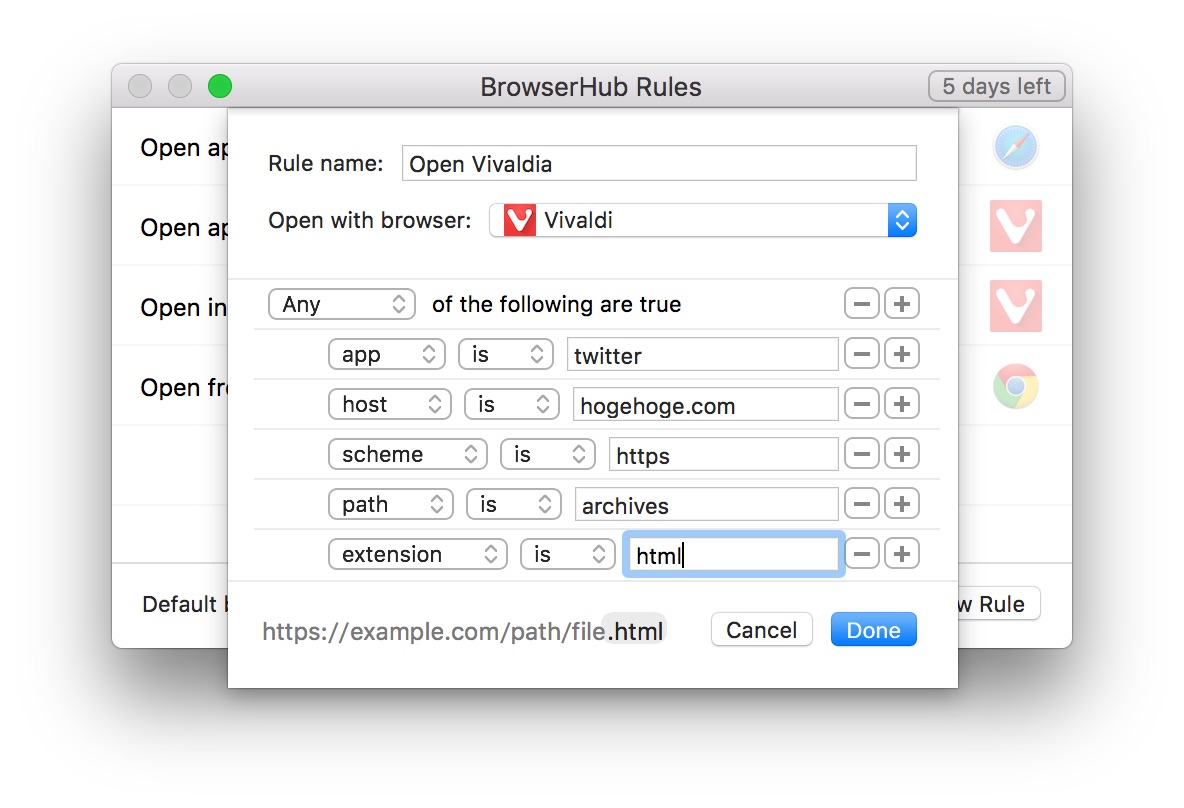 次にBrowserHubを開いてルールを決めていきます。ルールは「App」「Host」「Scheme」「Path」「Extension」から選択可能で、それぞれ以下の様な動作をします。