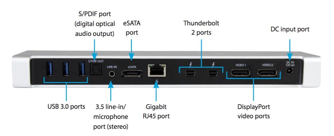 The Thunderbolt 2 Dual Video Docking Station offers a higher level of productivity for users who need multiple high-resolution monitors, and expanded device connectivity. With a variety of ports, including digital optical audio and eSATA, users can connect up to 12 devices. For the ultimate Thun