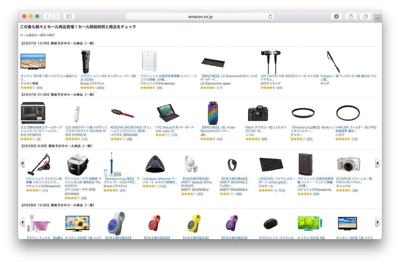 Amazonの「家電タイムセール祭り」では2月27日、28日限定で各時間別に液晶テレビやディスプレイ、タブレット端末などがタイムセールになるので、欲しい家電がある方はAmazonのタイムセールサイトの下の方にある「セール開始時間と商品」をチェックしてみてください。