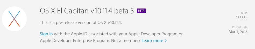 - 2016年03月01日:OS X El Capitan 10.11.4 Beta 5 (15E56a)