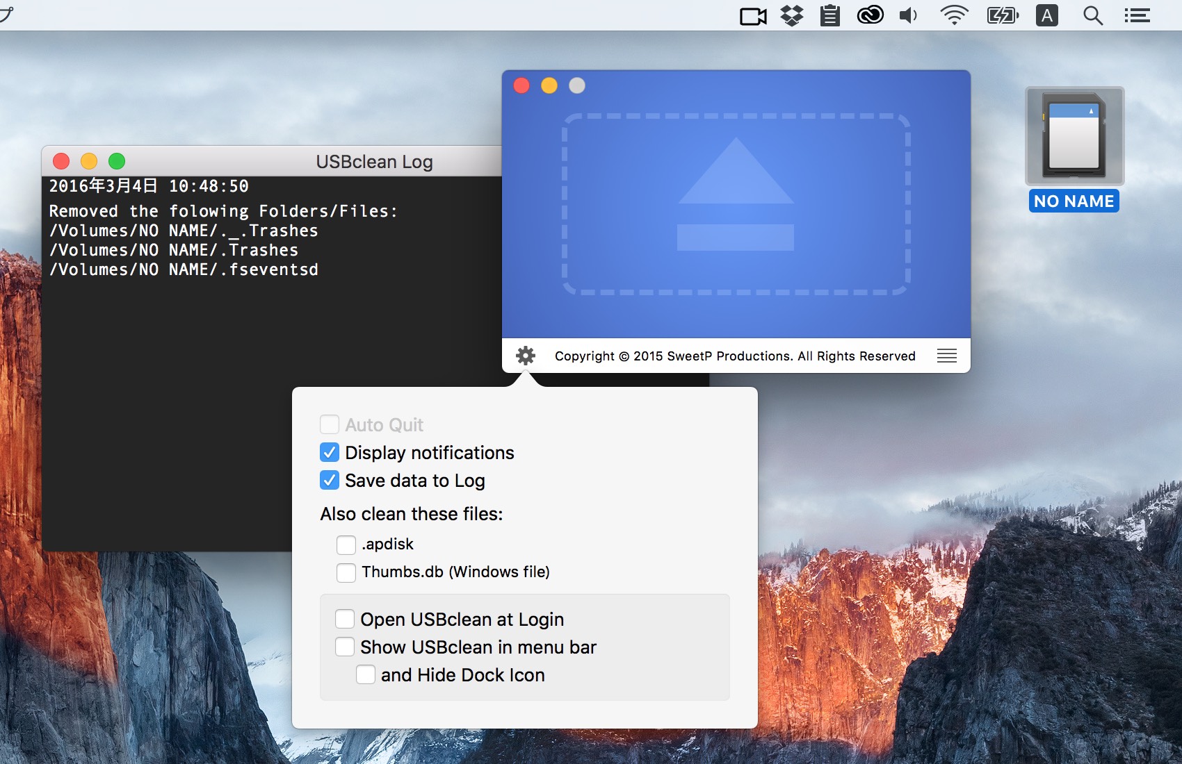オプションにはLogウィンドウを表示したり、メニューバーアイコンの表示、通知センターでの通知、OS Xの.apdiskファイル、WindowsのThumbs.dbファイルの削除などが用意されているので、Windowsユーザーとファイルをやり取りする方は利用してみてください。