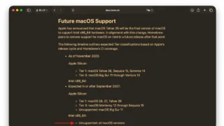 macOS 26 Tahoe macOS 15 Sequoiaのソフトウェアアップデート画面から「その他のアップデート」で情報ボタンをクリックすると「macOS 26 Tahoe」がデフォルトで選択されており、誤ってTahoeへアップグレードされる危険があるので注意を。