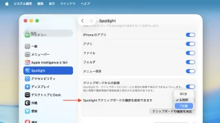 macOS 26 Tahoe macOS 26 TahoeのSpotlightに追加されたのクリップボード機能はデフォルトでOFFになっており、保持期間は8時間までで、パスワードなどの機密情報の除外機能は実装されていないので注意を。
